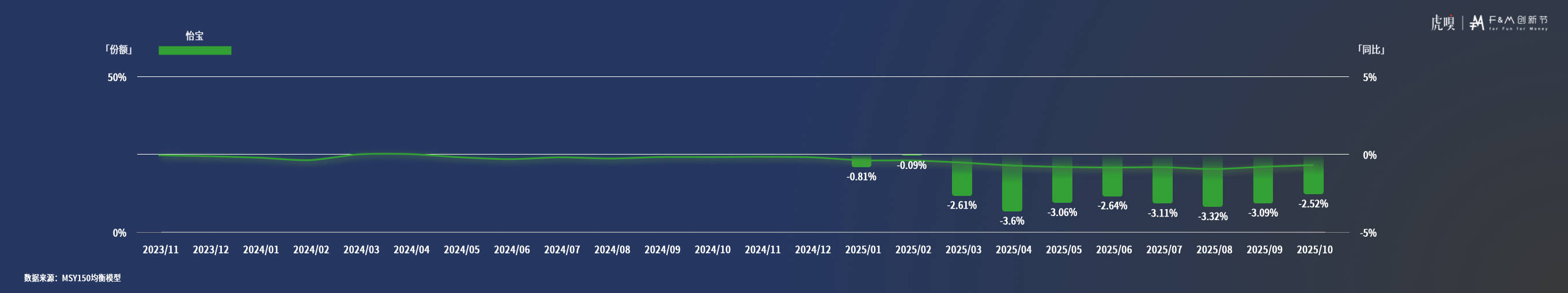 去年我们分享时就提到过农夫山泉和娃哈哈的包装水市场份额之争,但是一年时间下来,娃哈哈依然保持稳中有升,农夫山泉虽然在去年受到了较大的影响,但也守住了基本盘,重新进入上行通道当中,受影响最大的,反而是“隔岸观火”的怡宝。其在2024年3、4月时,市场份额一度摸到了第一名农夫山泉,但在一年多以后的2025年7、8月,其市场份额已经几乎要被娃哈哈追上。