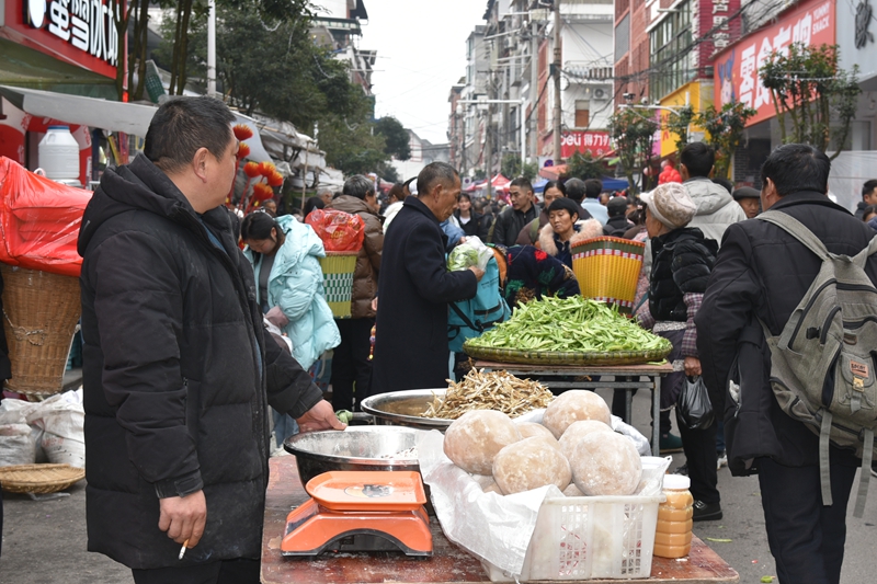 “乘着年底乡场的人气,我就把自己种植的叶子烟、茶叶带到集镇卖,也有300多元的收入。”容光镇元木村群众谢世国边给顾客秤叶子烟边说起年终乡场带来的好处。