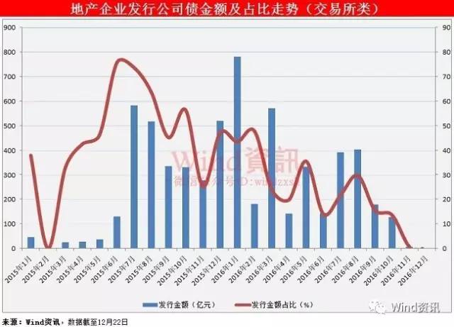 Wind资讯(微信号windzxsh)统计数据显示,截止到去年12月22日,房地产企业发行公司债8077.08亿元,占比同期国内公司债发行总额为29.24%。从发行额来看,远超2015年全年4292.95亿元的发行额,但是相比2015年全年发行额占比41.39%,比例已大幅下滑。