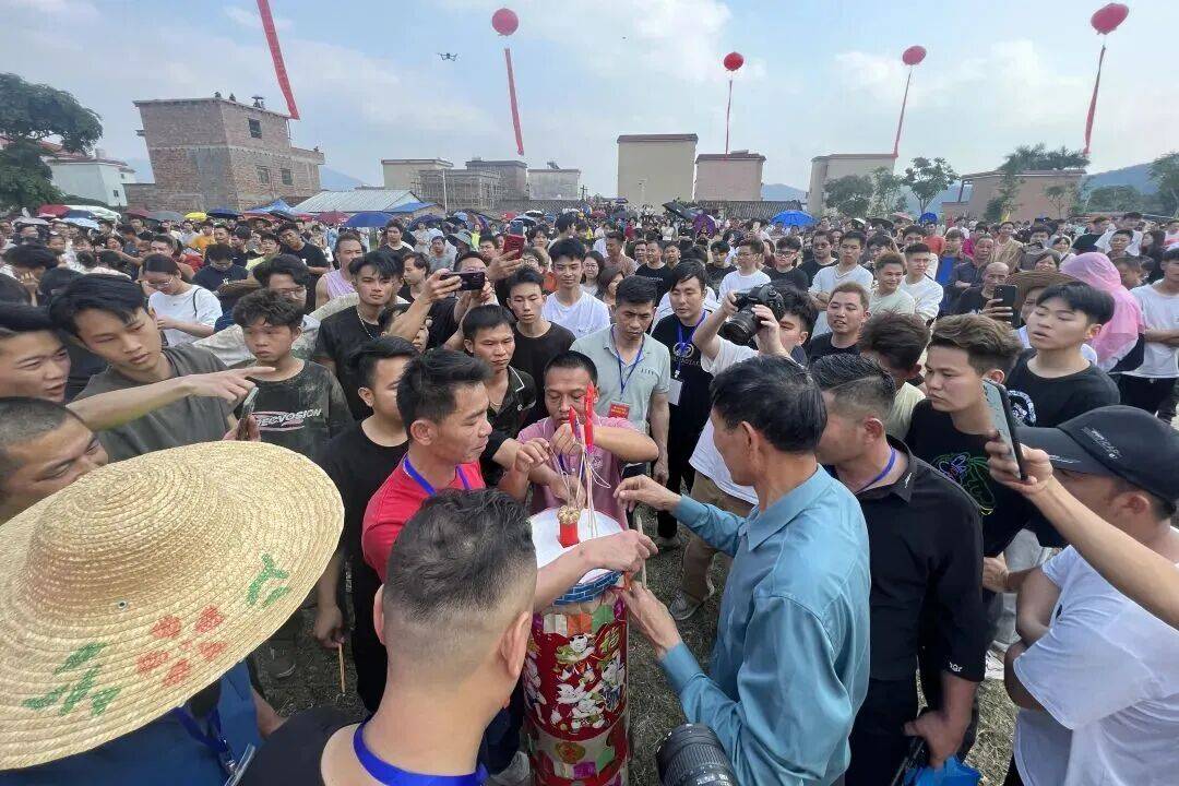 抢花炮活动已经有五百多年历史,最初为祈福还愿仪式,如今已成为新兴县天堂镇最具特色的新春民俗,列入市级非物质文化遗产名录。元宵节前后,众人聚集在开阔地,点燃塔楼上的鞭炮,炮圈冲天而起,人们争相抢夺,抢到炮圈者寓意新一年顺风顺水、大吉大利,抢得公炮者更有“六畜兴旺、财源广进”的好彩头。