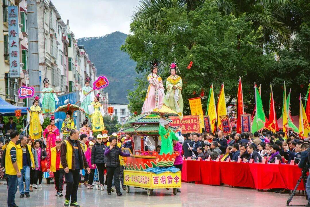 连滩飘色是一项融合了戏剧、魔术、杂技、音乐与舞蹈的综合艺术形式,它始于明末清初,源于张公庙会巡游,2012年入选省级非物质文化遗产名录。一板板色彩艳丽的飘色巡游而过,神话故事、历史传说在演员们的演绎下栩栩如生。